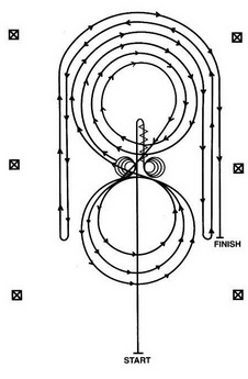 6. Inicie na mão direita, complete 3 círculos à direita: os dois primeiros grandes e rápidos e o terceiro pequeno e lento. Trocar de mão no centro da arena