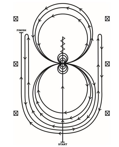 3. Começando na ponta direita, complete dois círculos para a direita: o primeiro sendo grande e rápido; o segundo círculo pequeno e lento. Pare no centro da arena. Pausa.