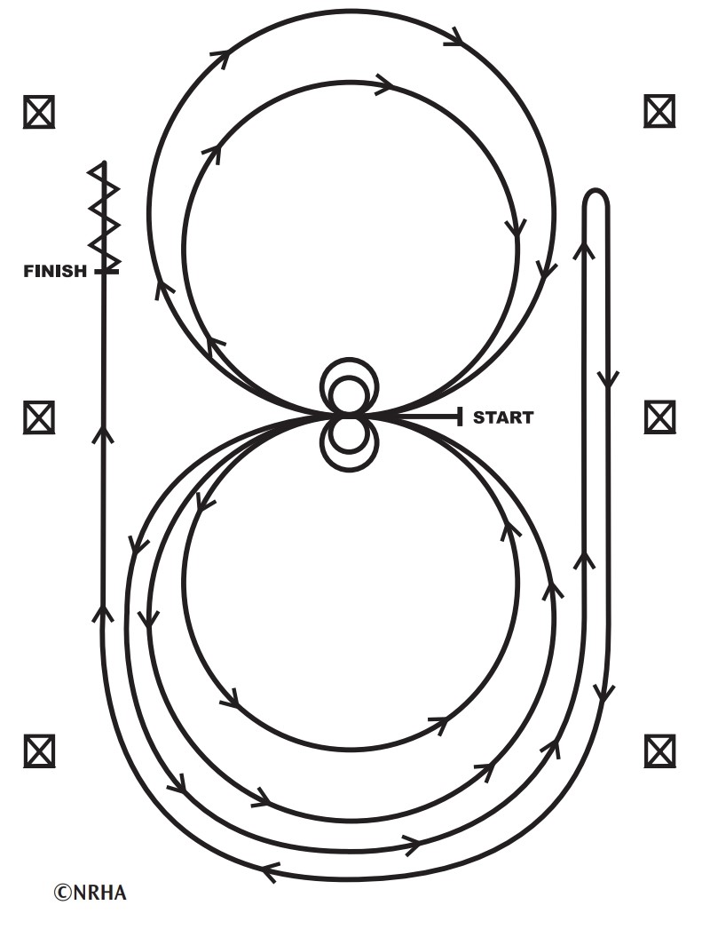 1. Começando na ponta esquerda, complete dois círculos à esquerda: o primeiro círculo grande e rápido; o segundo círculo pequeno e lento. Pare no centro da arena. Pausa.